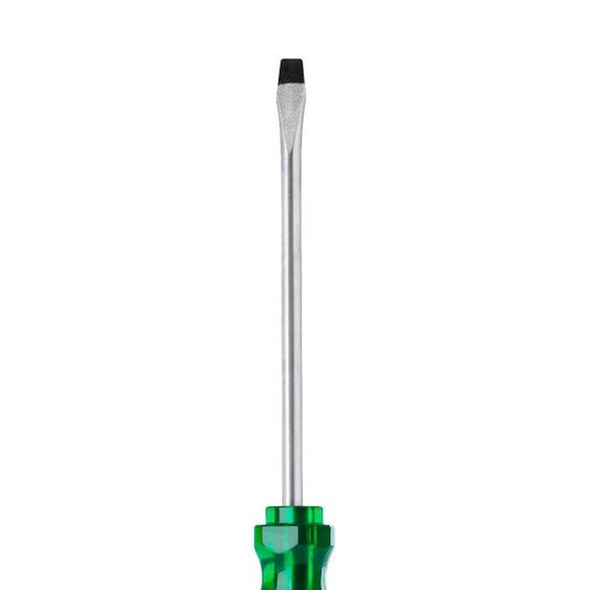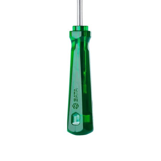 A chave de fenda Sata 1/8 x 6 apresenta um cabo em PVC translúcido verde ergonômico, com ponta oxidada que evita descascamento e proporciona maior segurança. Com haste temperada, acabamento niquelado e cromado, é ideal para uso profissional pesado.