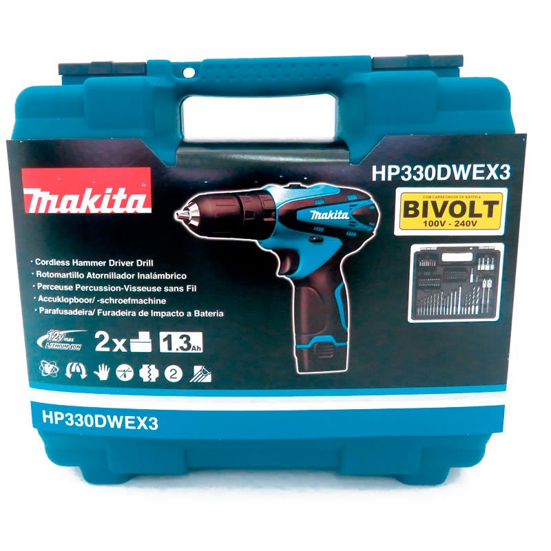 Kit Parafusadeira DF330DWE Makita + 2 Baterias + Carregador + Jogo de Bits e Brocas